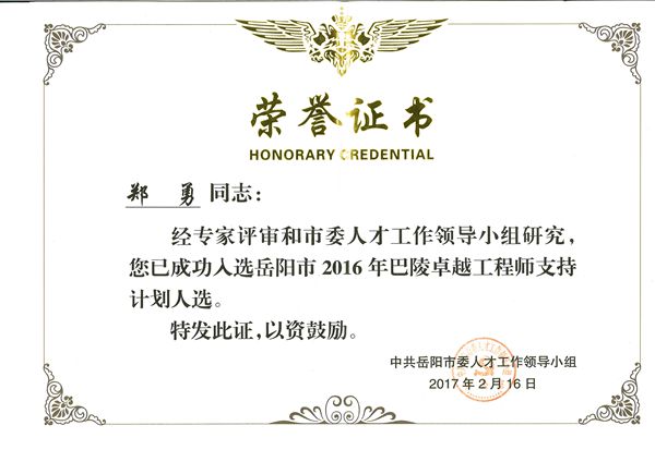 我公司首席工程师郑勇先生获评岳阳市“巴陵卓越工程师”