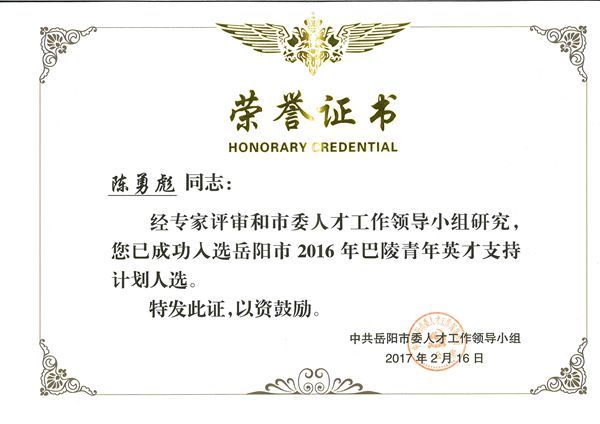我公司总经理陈勇彪先生获评岳阳市2016年“巴陵青年英才”